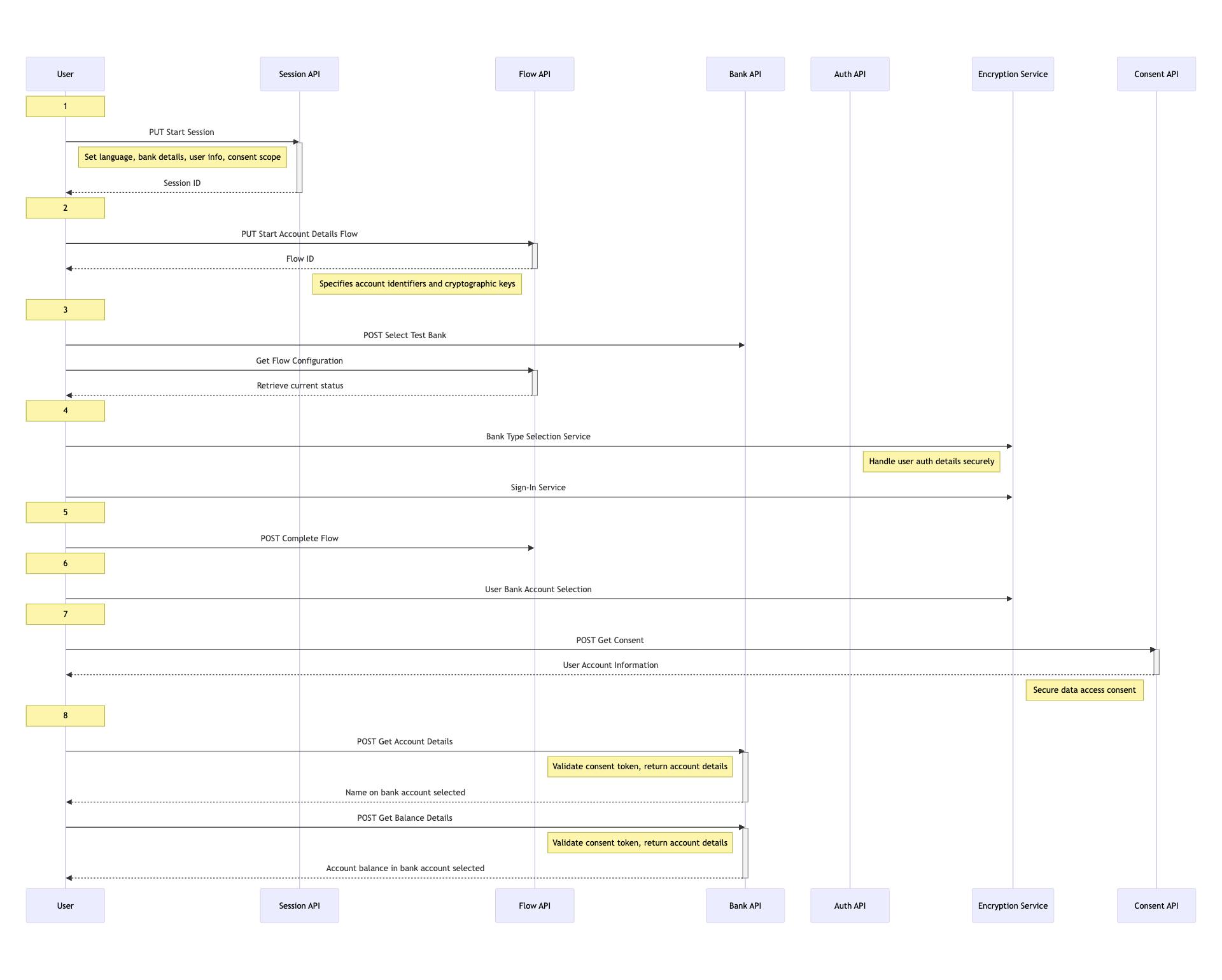 PUTrequest, this time to initiate an account details flow. By further specifying account identifiers and cryptographic keys, we are ensuring that all communication is secure. - Select Test Bank: A